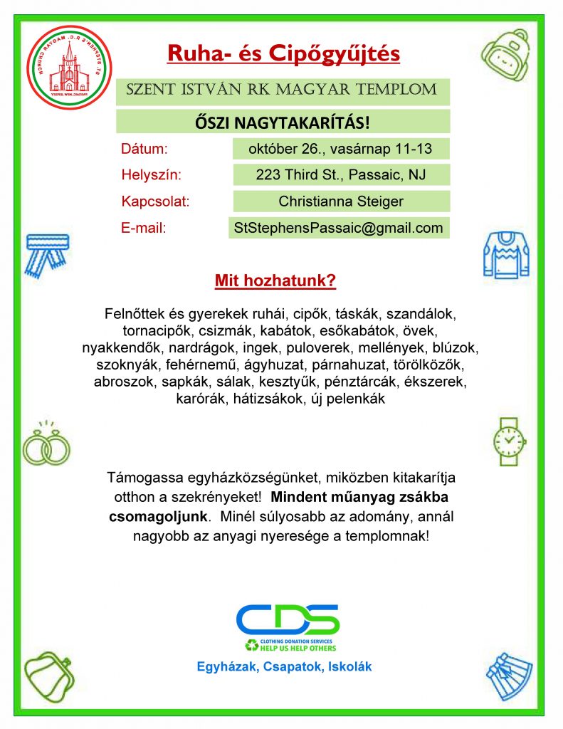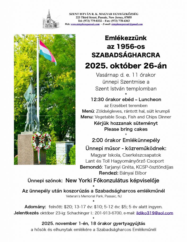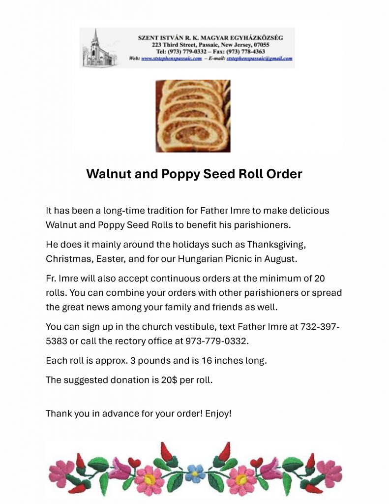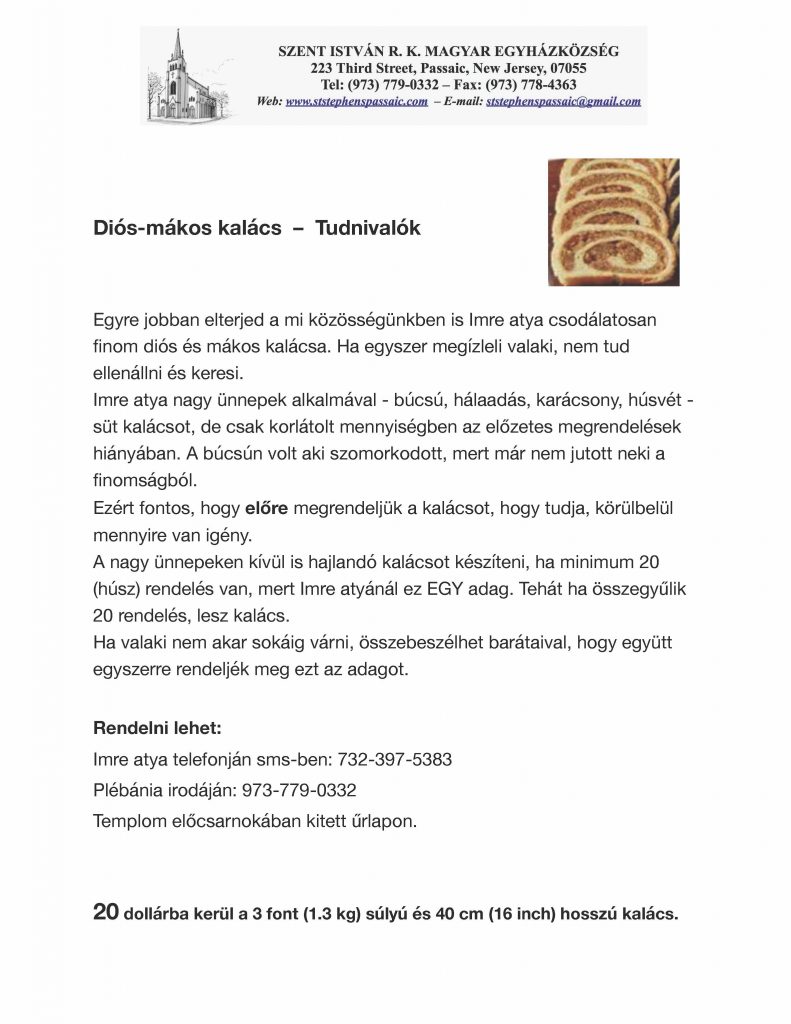 Akik otthonukban szeretnének szentáldozáshoz járulni, hívják a plébánát a 973-779-0332-es telefonszámon, vagy jelezzék emailben a StStephensPassaic@gmail.com címen. Távolság nem akadály!